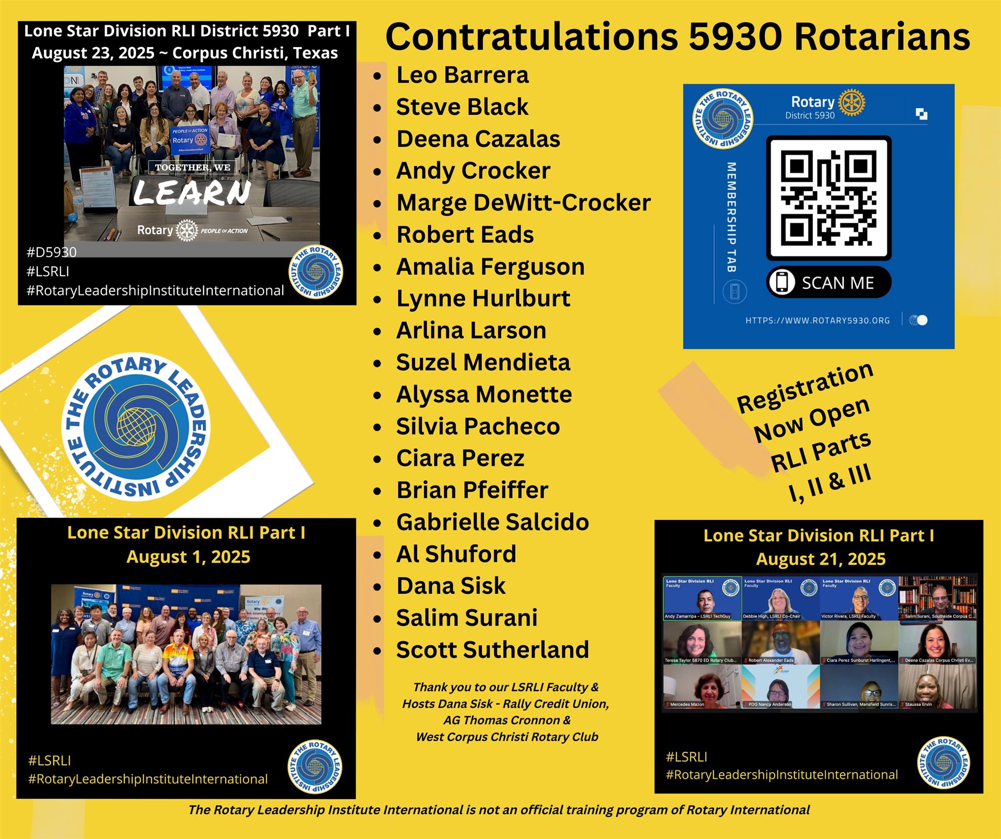 Congratulations is in order for 19 Rotarians representing various Rotary clubs in Rotary District 5930 South Texas who participated in the recent Rotary Leadership Institute (RLI) learning facilitation courses that were offered in August 2025. Each Rotarian has received their RLI Part 1 Certificate of Completion!