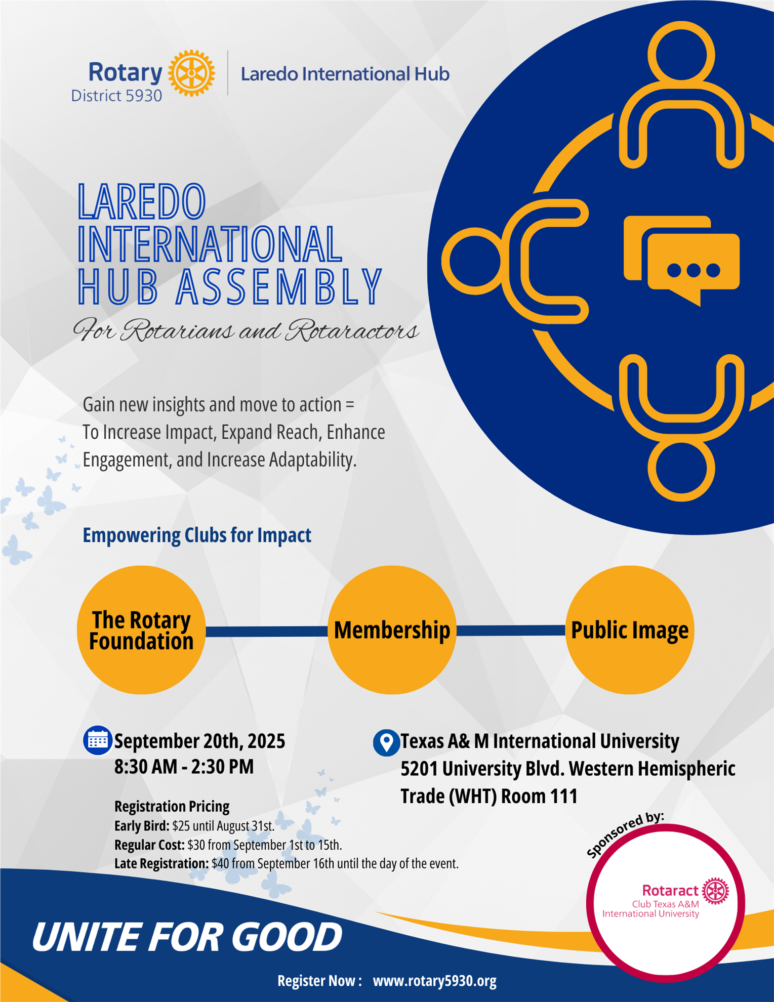 Registration is open to this event for all Rotarians and Rotaractors, not only for the five Rotary Clubs in Laredo but also for the TAMIU Rotaract Club, and any other interested Rotarians in our District. Click here to register.