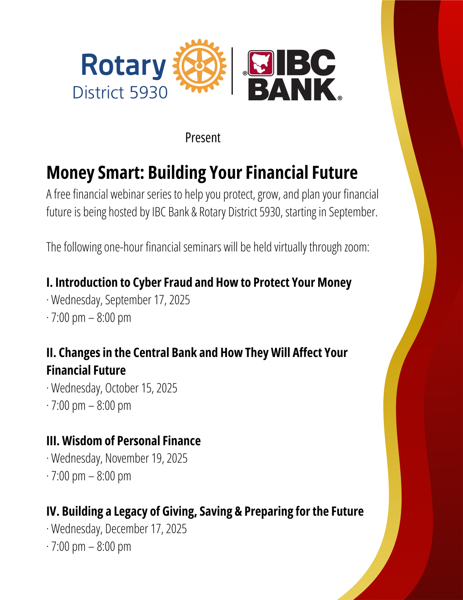 A free financial webinar series, hosted by IBC Bank & Rotary District 5930, will start in September to help you protect, grow, and plan your financial future.