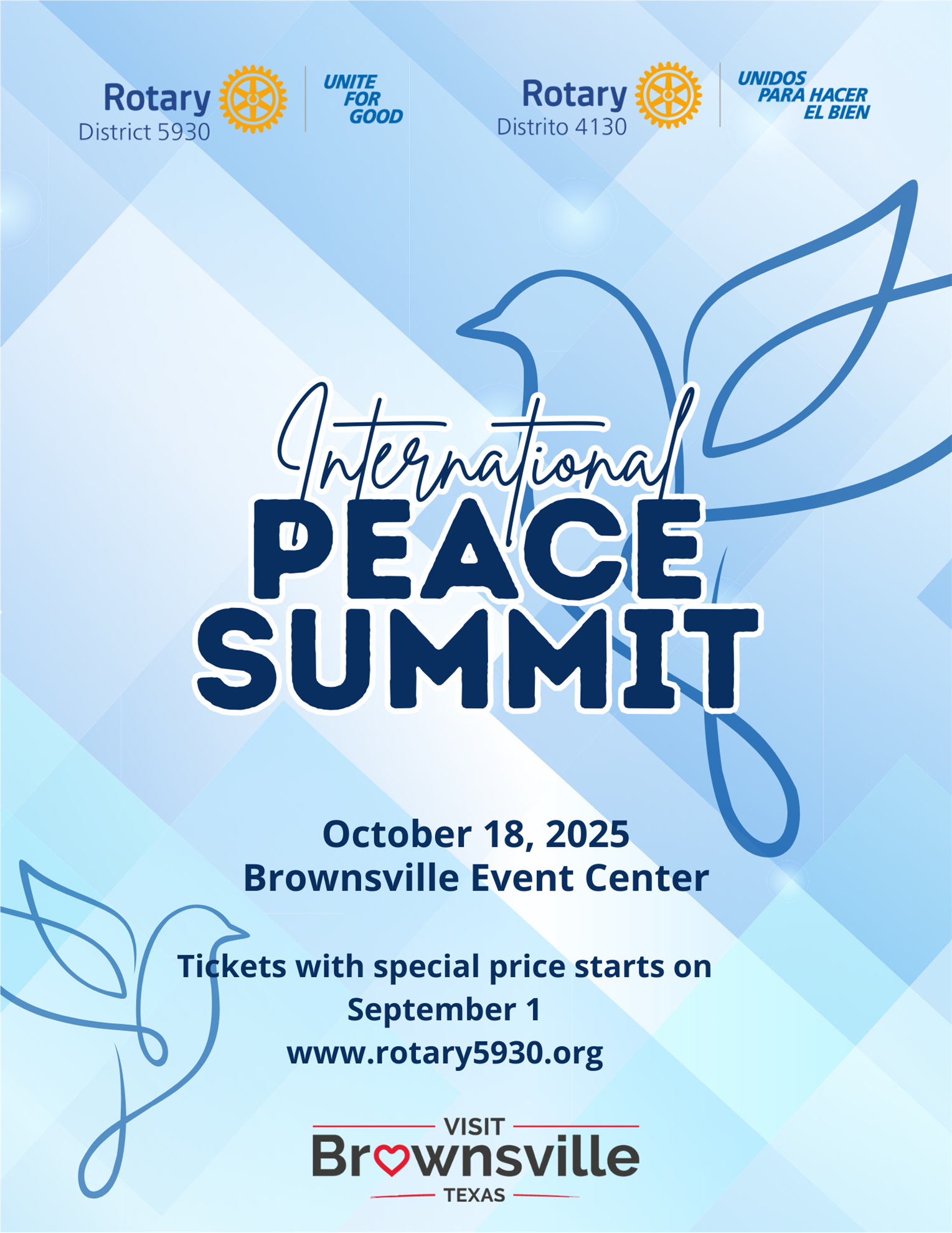 Our first annual International Peace Summit is being organized by D5930 (South Texas) and D4130 (Northeast Mexico) and will feature RID Salvador Rizzo Tavares, DG Alma Garcia BetancourtD4130, and DG Craig Hardy D5840 sharing his story about Rotary’s response to the Central Texas Catastrophic Flooding on July 4, 2025.