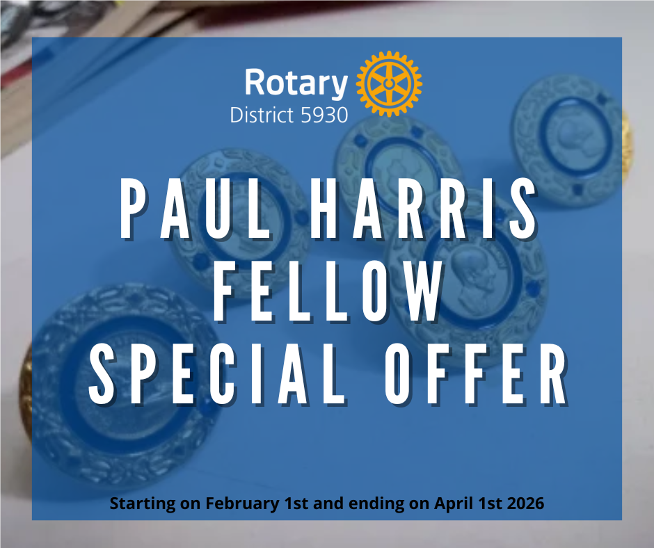 Using Rotary Foundation Recognition Points generously donated by anonymous donors, we will match contributions of New Cash made to the Annual Fund-SHARE during Rotary Year 2025- 2026 on a 1:to:1 basis in amounts of $100.00 to $500.00 for any active Rotarian in District 5930 who is not yet a Paul Harris Fellow +8. The intent of this initiative is to help increase the number of Paul Harris Fellows in our District and also support the Annual Fund-Share program.